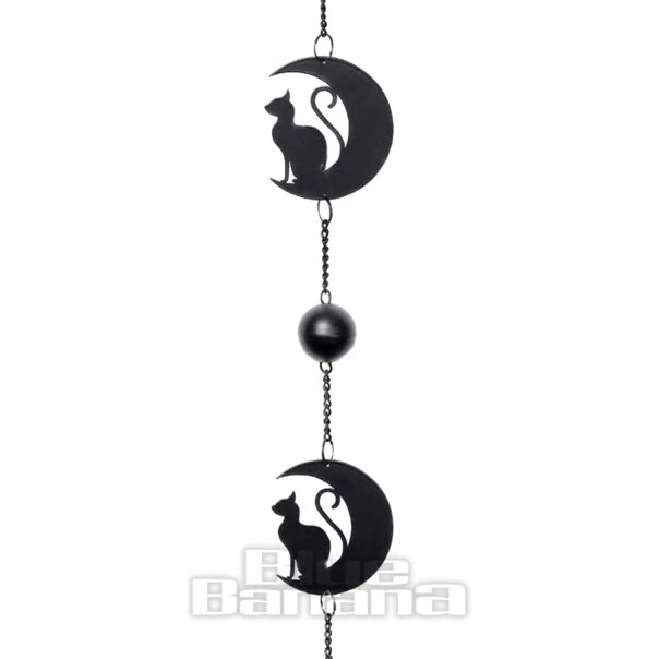 Alchemy Gothic Black Cat & Moon Hanging Decoration in Black. This 83cm homeware decoration is a perfect addition to any gothic abode, although it can be used both indoors and out. Perfect as not only a hanging decoration but could also be used as a wind chime. This could be a perfect gift for any fans of gothic, dark or witchy fashion.