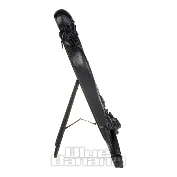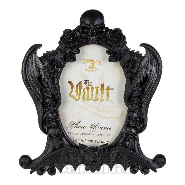 The Alchemy Gothic Nosferatu Photo Frame in Black. This photo frame is made in a fantasy Gothic horror style with skulls, dragons and bats surrounding the frame. Add to your alternative home decor or give as a gift. Fits a standard 4″ x 6″ picture.