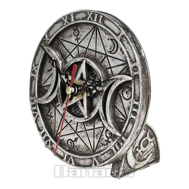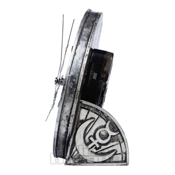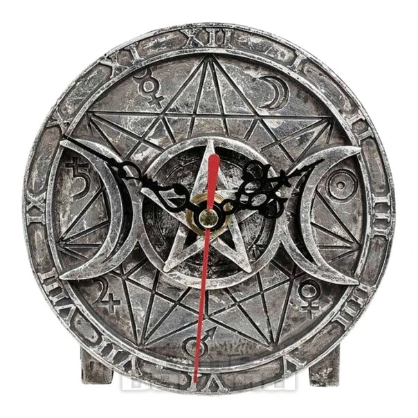 Alchemy Wiccan Desk Clock in Silver. This battery-powered desk clock is designed with an array of symbols including stars, triple moon and pagan symbols. Perfect for display on your desk, bookcase or fireplace. Complete your witchy vibe with this ornamental clock.