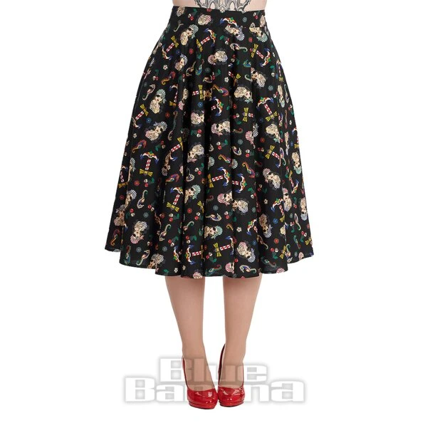 The Banned Anchor Pin Up Dress in black. This A-line skirt compliments any rockabilly style. With fun nautical print, you won’t want to miss out on this alternative midi skirt!