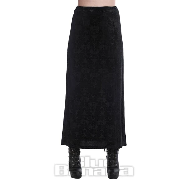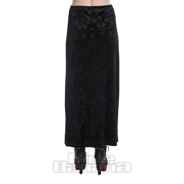 The Banned Chandelier Maxi Skirt in Black features a slit up the side and an occult print on the velvet material. Perfect for alternative witchy outfits.