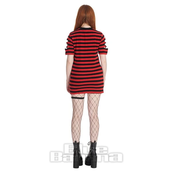 The Banned Toxic Tears Dress in red. Available in sizes XS – 4XL. Channel your alternative punk vibes with this striped mini dress. The design features cutouts to the arms and torso for extra grunge and Goth style.