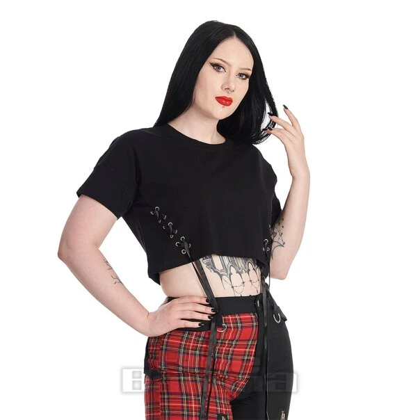 The Banned Yuri Top in Black. A black cropped t-shirt featuring corset style satin laces making a perfect addition to any Gothic wardrobe.