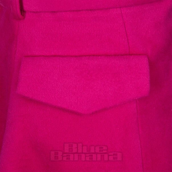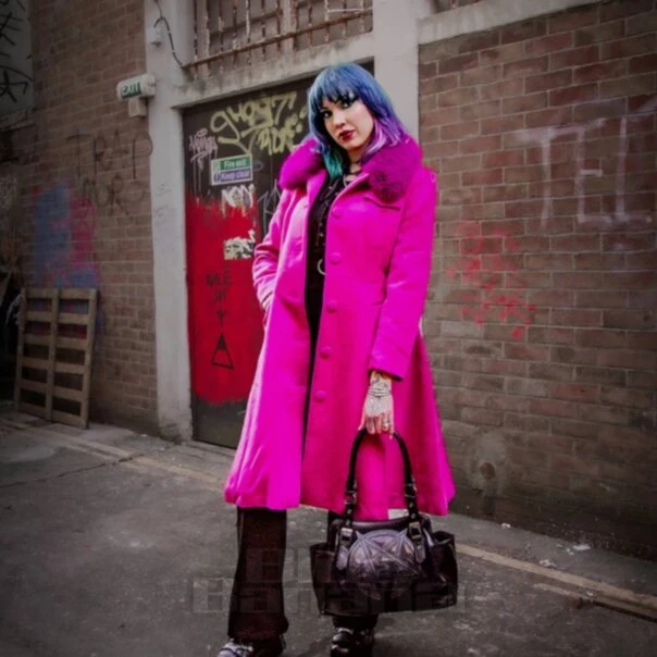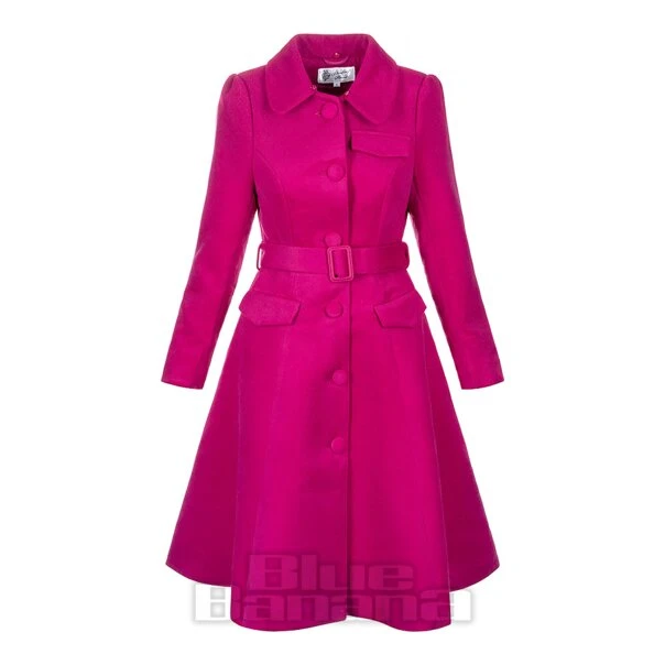 This bright pink 50s-inspired coat features a fur collar with button-down front and belt. This range is exclusive to Blue Banana!