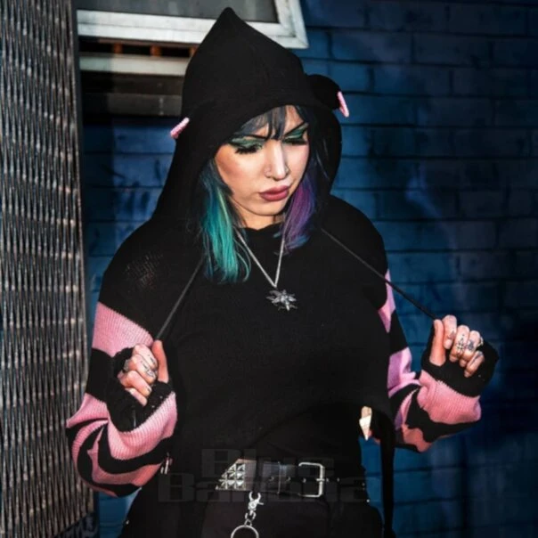 The Cupcake Cult Cute Kitty Hoodie is an adorable wardrobe staple for any goth. With striped sleeves, cat ears on the hood and cropped style, this jumper is a cute winter option.