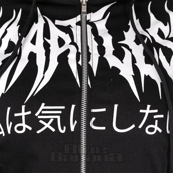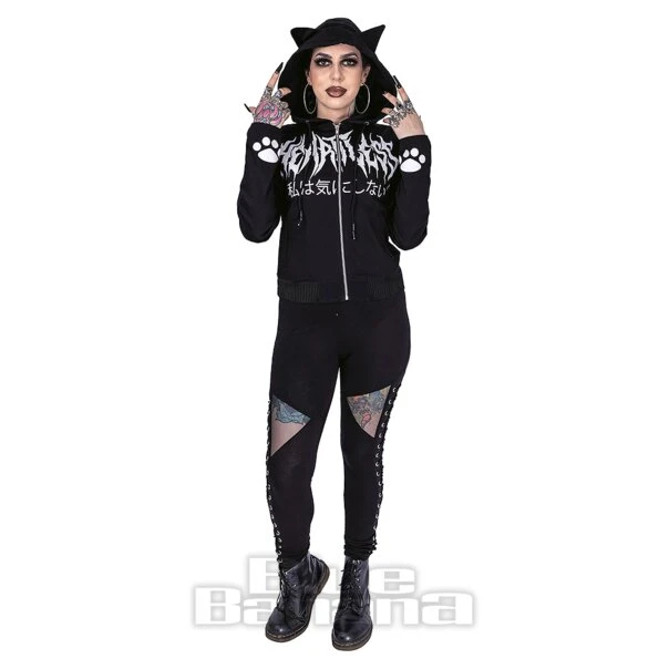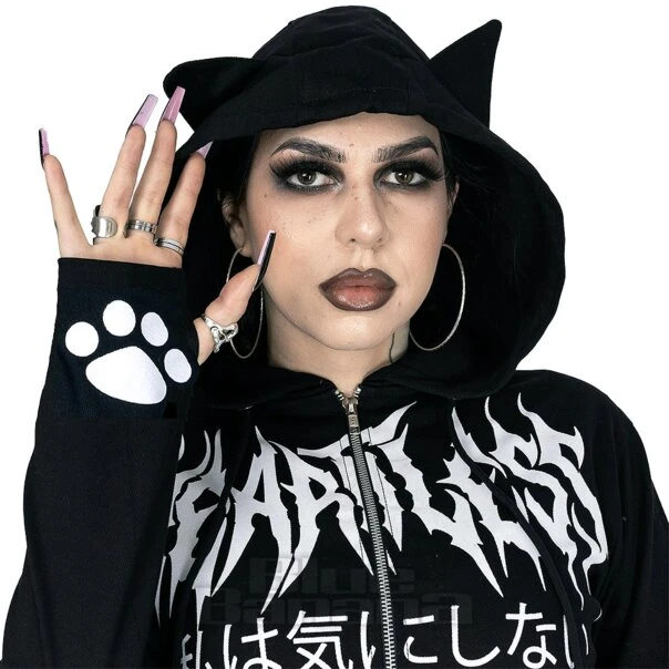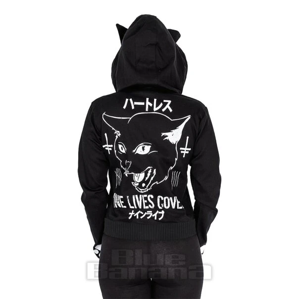 The Heartless Nine Lives Jacket in Black. Available in sizes XS – XL. This Gothic hoodie features a cat graphic to the back paired with cute cat ears to the hood. This is completed with text to the front and back of the jacket. Perfect for pairing with your alternative or witchy fashion.