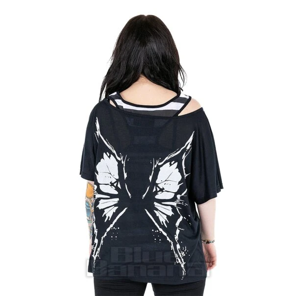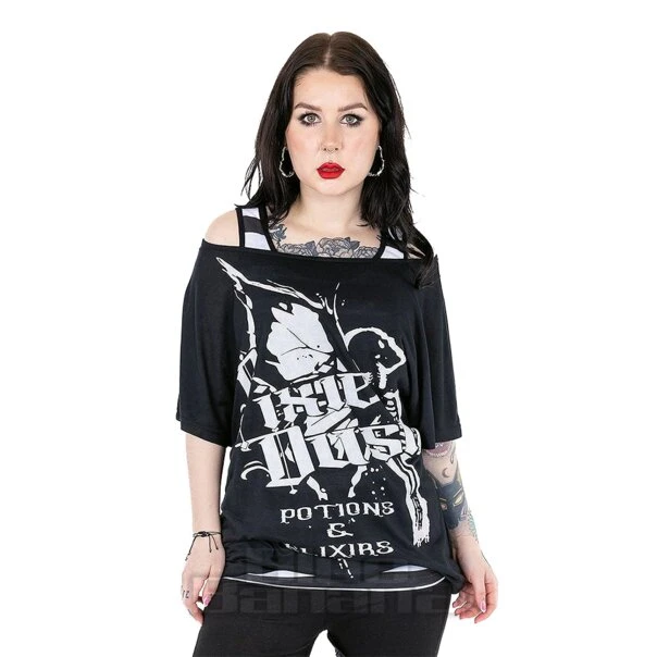 Looking for a causal gothic top to add to your wardrobe? Check out the Heartless Pixie Potions Top with striped vest, and cold-shoulder outer top and graphic print.