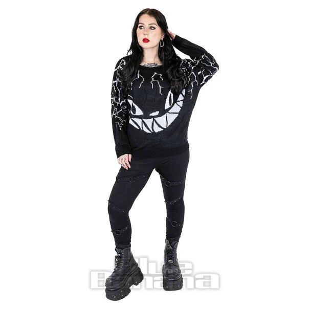 The Heartless Sinister Grin Jumper in Black. This unisex gothic jumper features an all-black print with contract white fissures and a sinister grin design.