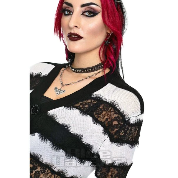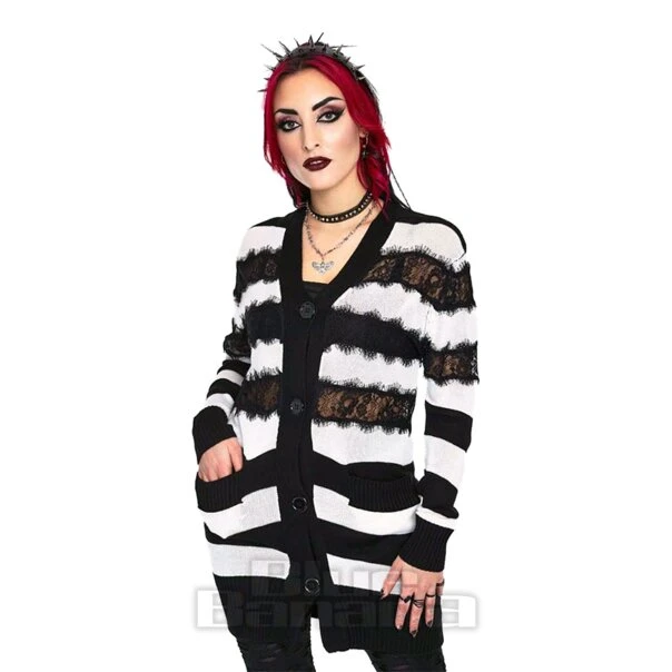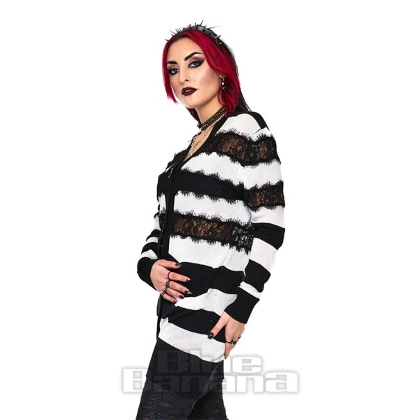 The Jawbreaker Lace Stripe White Cardigan is an oversized long cardi with black lace panels. Pair with gothic and alternative outfits.