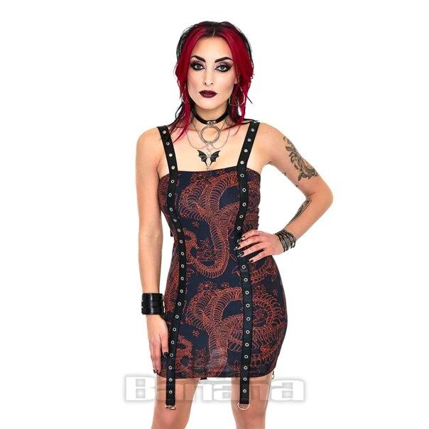 The Jawbreaker Skeleton Snake Bodycon Mini Dress in Black/Red features an alternative occult snake design with black eyelets for a Gothic twist.