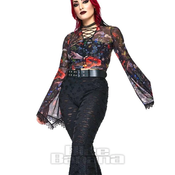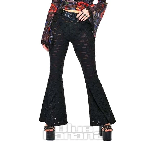 These gothic flare trousers can be paired with almost any outfit! With a distressed look and flared style, the Jawbreaker Venom Trousers are a wardrobe essential.