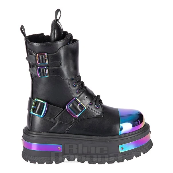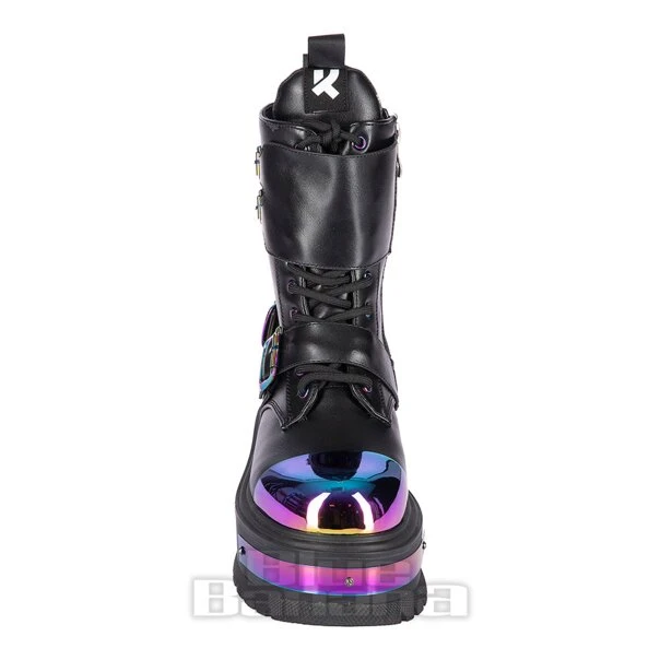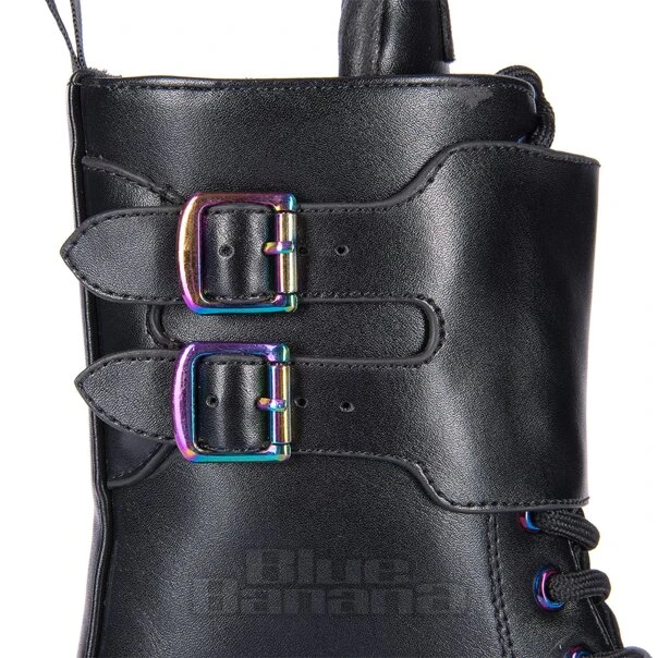 Go vegan in style with the Cosmic Fire Platform Boots from Koi. Complete with metallic rainbow toe caps and buckles, these gothic boots will have you stomping the sidewalk in no time.