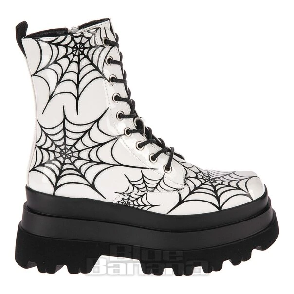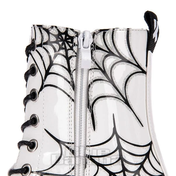 The Koi Web Trap Boots have cool black spider web patterns on a white background. The chunky platform soles are a perfect addition to any gothic wardrobe. They’re even 100% vegan too!