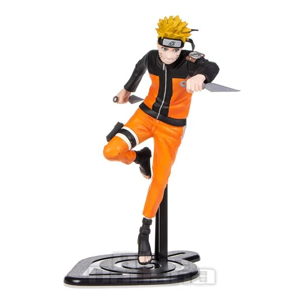 The Naruto Uzumaki Figurine from Official Naruto Shippuden. Available in 17CM. This anime figurine features the character Naruto in a dynamic pose holding two kunai blades, standing on a Konoha symbol base. The perfect collectable for any Naruto fan.