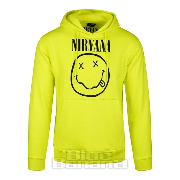 The Official Nirvana Hoodie in Yellow. Available in sizes UK S to UK XXL. This officially licensed merchandise features the Nirvana smiley Face logo on the front with drawstring hood and front pouch. Add this yellow Nirvana hoodie to your merch collection.