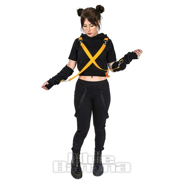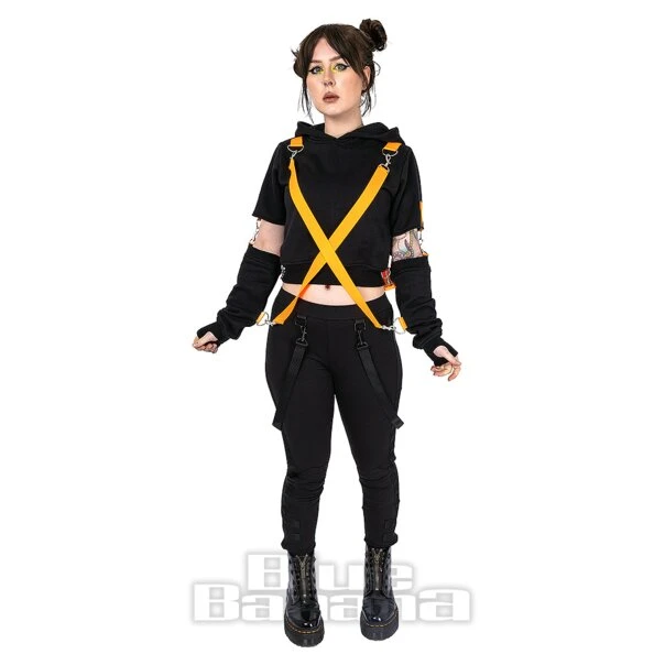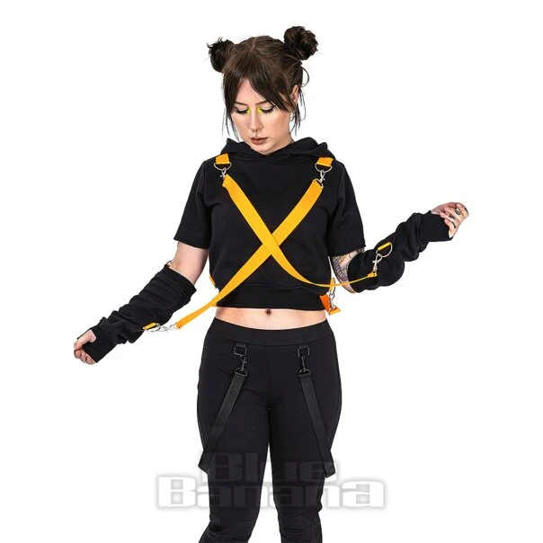 Poizen Industries Dystopian Hoodie in Black/Orange. Available in sizes S to L. This hoodie features detachable orange straps across the front and back with detachable sleeves. Perfect for any alternative wardrobe.