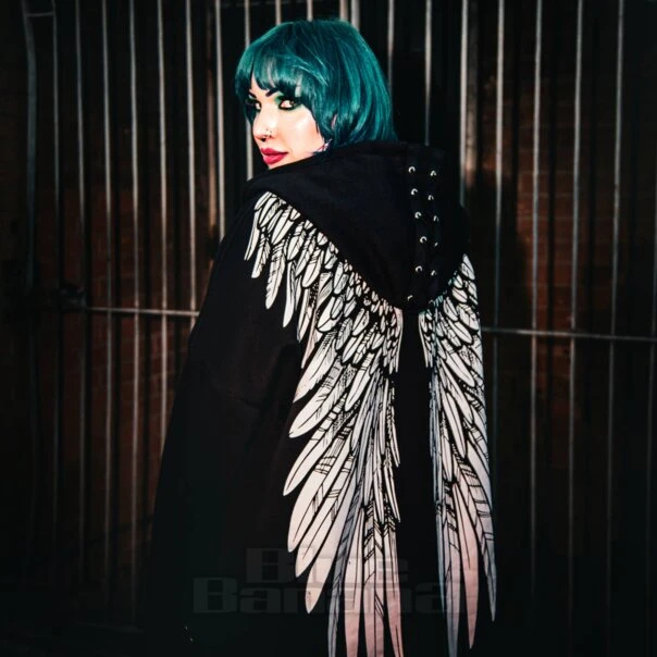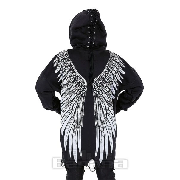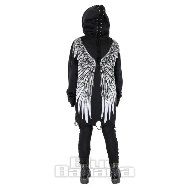 This oversized gothic hoodie is sure to be a showstopper! With a pair of wings printed on the back and the lace-up pocket details, this jacket will complement your gothic style.