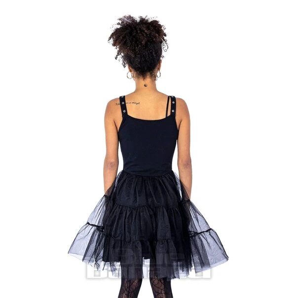 The Vixxsin Selkie Dress in black. This alternative dress offers a ruffled skirt and corset-style bodice for the ultimate gothic look. Dress it up for prom, an evening out or a casual gothic day look – the possibilities are endless!